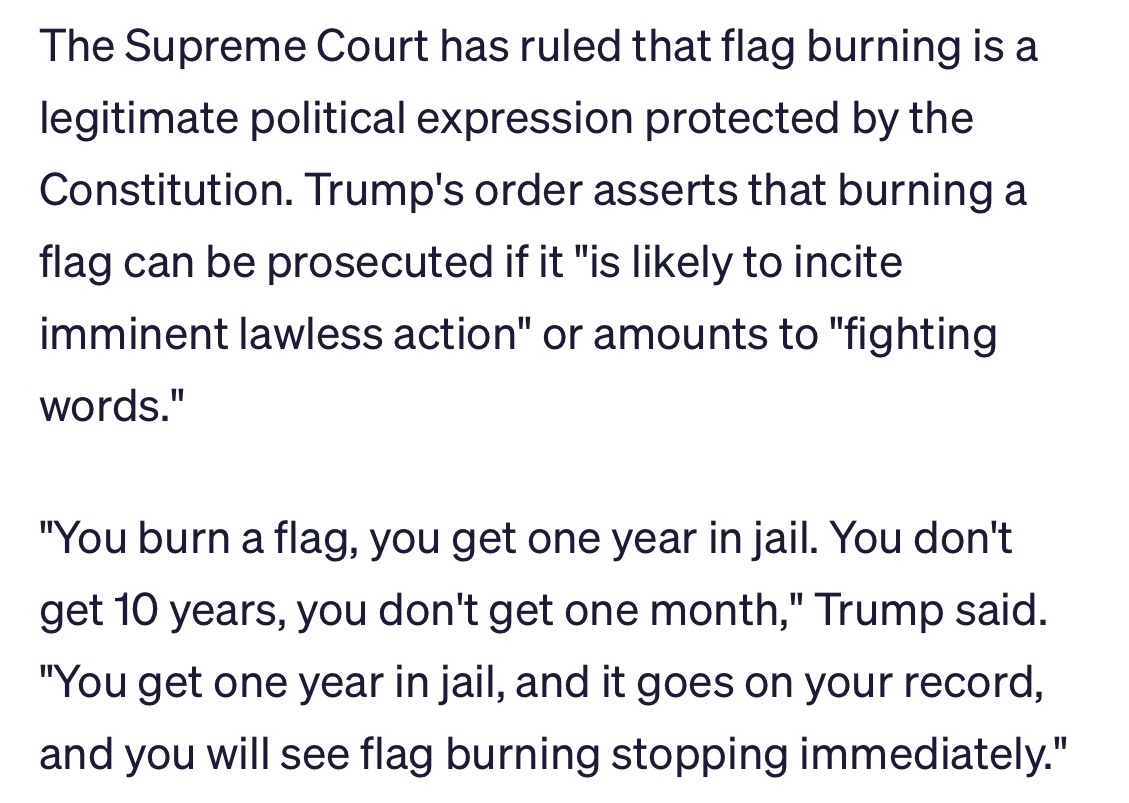 @AmerigoPinochet I have TDS by taking Trump at his word? Huh? President Trumpās words on the Mediate page says you will go to jail for burning a flag. Those words are words he typed on Truth Social. See how the word āanybodyā has a specific meaning? Youāre saying Trump canāt be trusted?