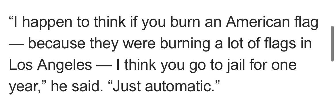 @RingroseonX You know how you can tell when a politician is lying? Their lips move. Are you just feigning ignorance or is it real? Can you name a single person who's been convicted, or even charged with flag burning since Trump said that? When you're done searching in vain for this