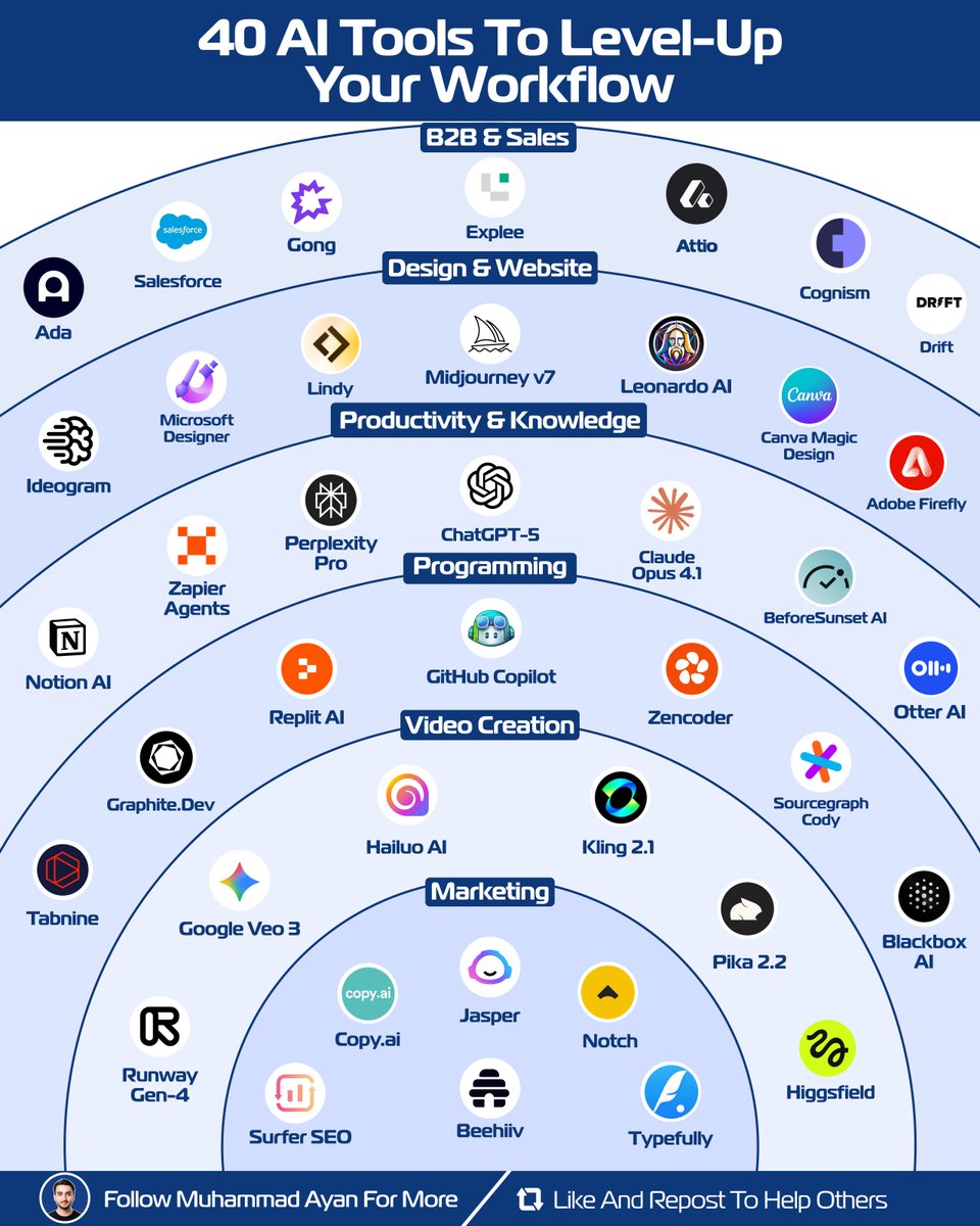 40 AI Tools to Level-Up Your Workflow Make yourself sing your favourite song: http://bit.ly/openartt 1. Sales - Ada - Drift - Attio - Gong - Explee - Cognism - Salesforce 2. Design & Website - Canva - Lindy AI - Leonardo - Ideogram - Adobe Firefly - MidJourney v7 -