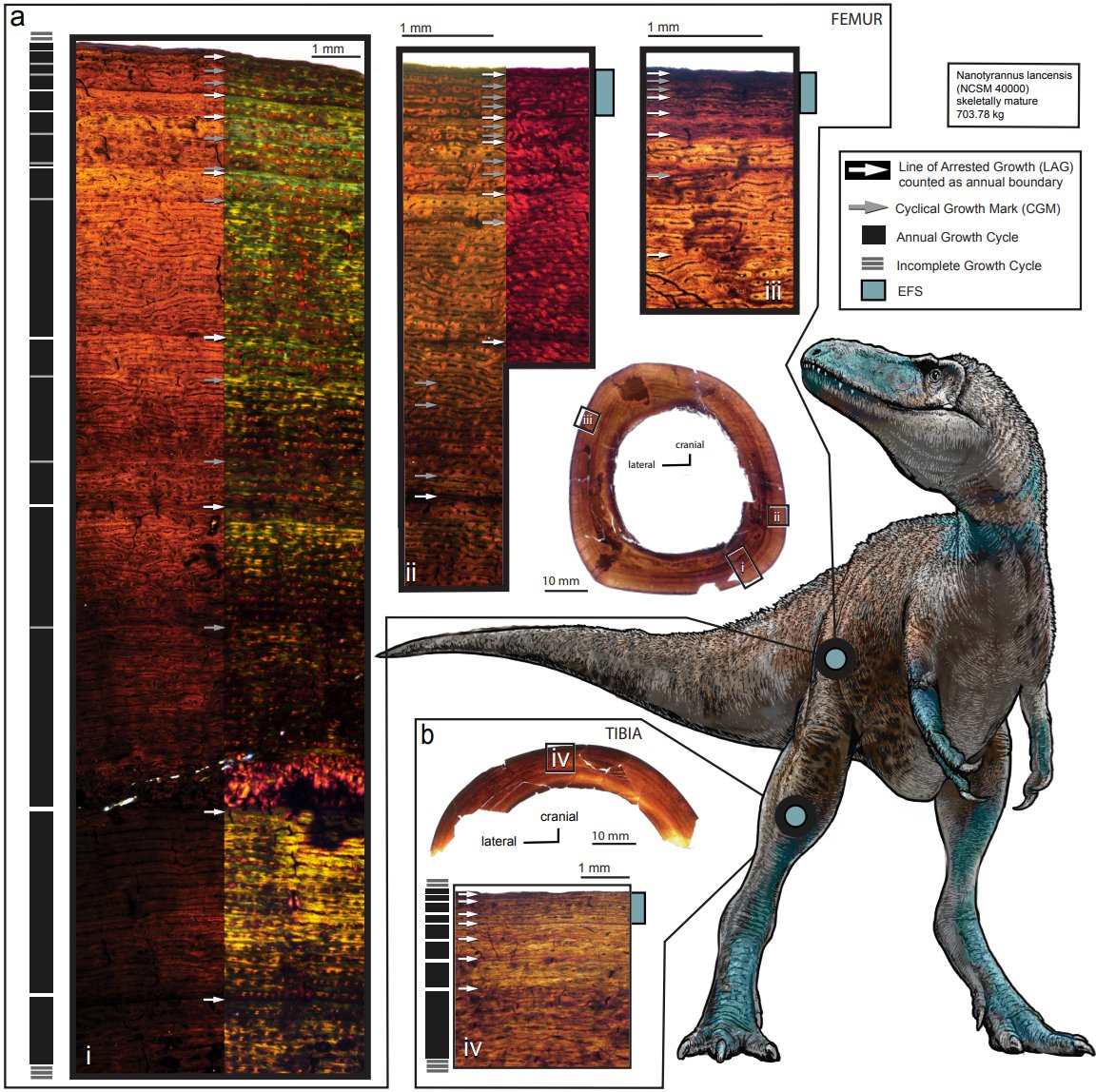 And finally, the growth record. I'll keep it short and sweet - the Dueling Dinosaurs tyrannosaur was an adult when it died. And an accessory sinus in its palatine bone, shared only with the Nano type specimen, is the apomorphy we needed to identify it as an adult Nanotyrannus.