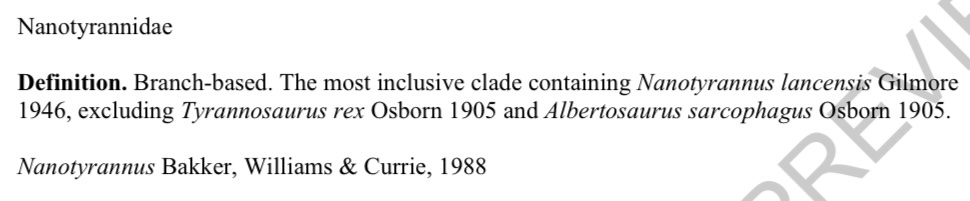 Now that the paper is out, I can unfortunately say that this doesn’t matter because Nanotyrannidae is a nomen nudum.