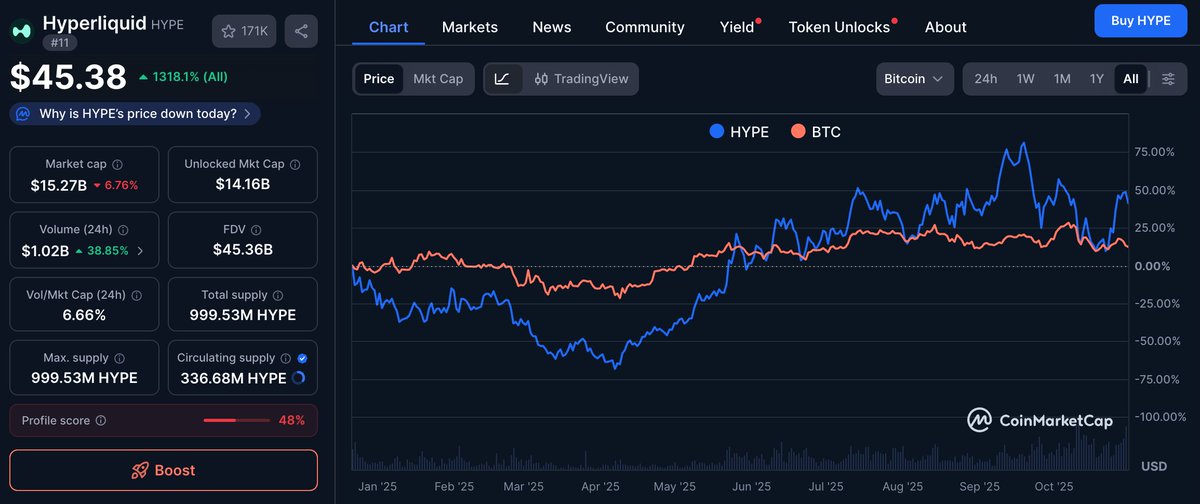 👇Hyperstuplid 🔴VC-backed DeFi casino for leveraged perps gambling. 🔴Ticker is literally HYPE. 🔴Endless token emissions. 🔴While it has outperformed Bitcoin, it was only launched in November 2024. ➡️Free market seems to agree. 📉
