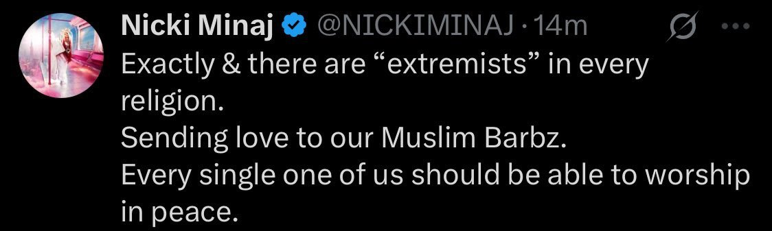 @NICKIMINAJ Always been a fan of your music, Nikki, and used to love to watch you periodically on the Ellen show with children… Really sweet… You know you’ll be vilified for posting anything that supports this administration… And I want you to know that in addition to being sweet And