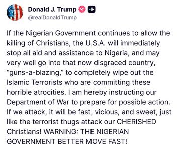 @NICKIMINAJ We, the people of Nigeria, strongly deny and reject the false claim being circulated online and attributed to U.S. President Donald Trump, which alleges that “thousands of Christians are being killed in Nigeria by radical Islamists.” This statement is completely false,