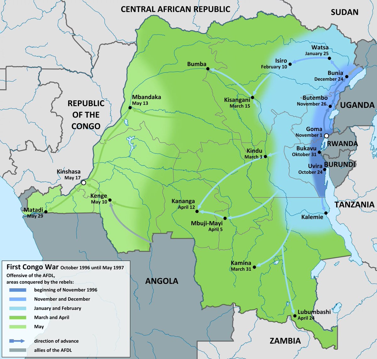 En 1997, le Rwanda est le principal acteur qui renverse Mobutu au Zaïre (RDC) durant la première guerre du Congo. Le Rwanda croit installer un pion à Kinshasa, mais Kabila se retourne contre Kigali et la seconde guerre du Congo débute en 1998.
