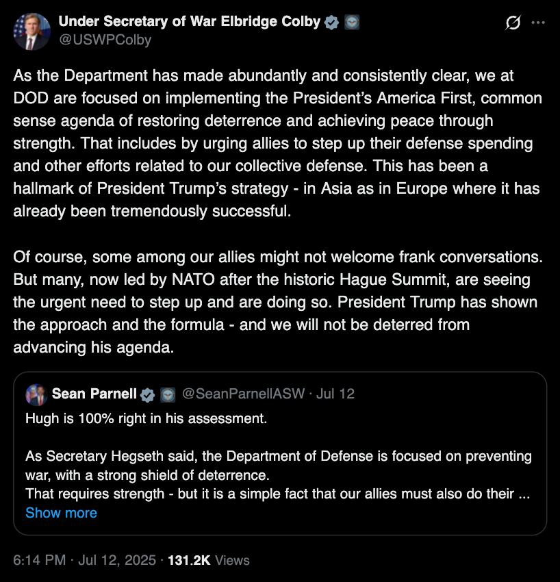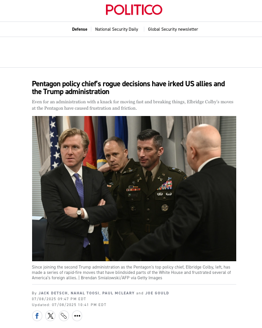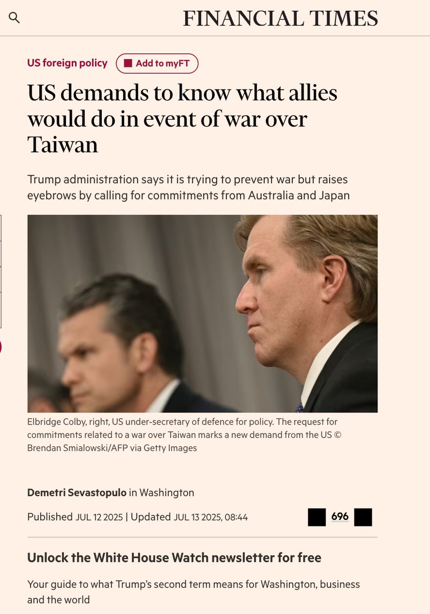 طبق گزارشها، اخیرا کولبی هم پیمانان ایندوپاسیفیکی آمریکا یعنی ژاپن و استرالیا را تحت فشار بسیاری برای حمایت از تایوان در صورت حمله چین گذاشته است، طوری که صدای توکیو و کانبرا را در آورده است. انتصاب تاکایچی به نخست وزیری و اظهار نظرهای خاص او در مورد تایوان که واکنش تند پکن را به