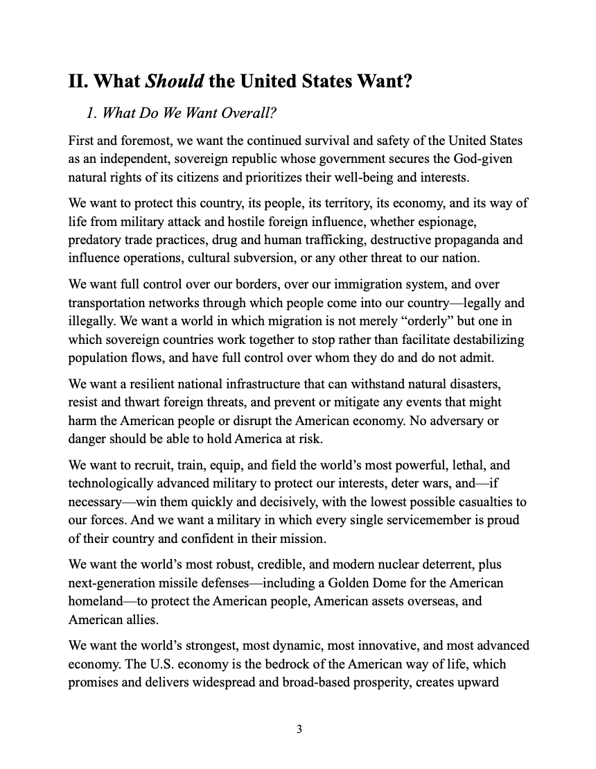 سند در همان مقدمه، نهتنها رویکرد «اولویتگرا»ی خود، بلکه منطق جکسونی–همیلتونیِ ضدنخبگانی و طرفدار احیای اقتصادی آمریکا را بهصراحت صورتبندی میکند. این سند رویکردی انتقادی و سلبی نسبت به تجارت آزادِ جهانی و جهانیسازی دارد و عملاً هیچ التزامی به «رسالت آمریکا در حفظ نظم لیبرال