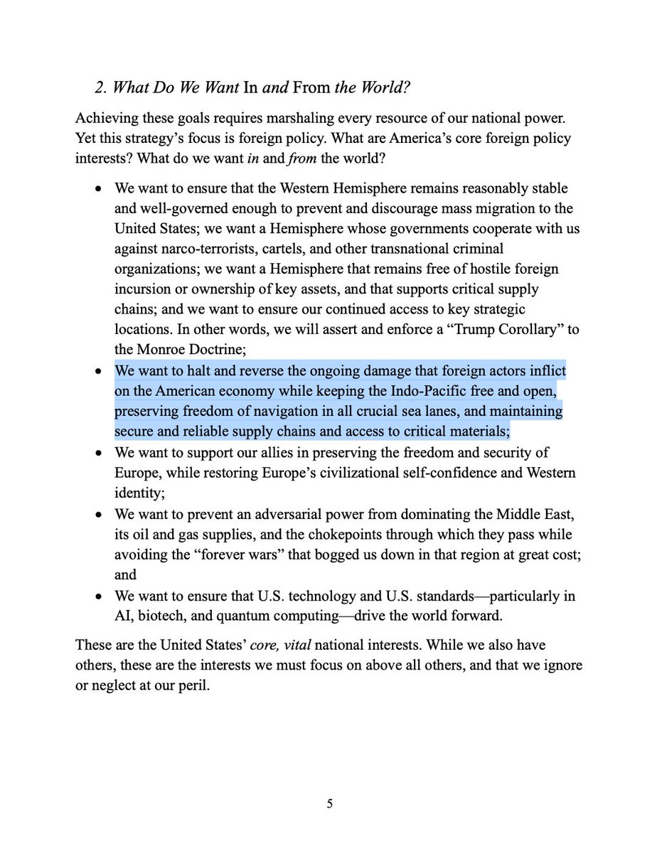 در حوزه ایندوپاسیفیک، سند از ایده «ایندوپاسیفیک باز و آزاد» حمایت میکند، ما نه با منطق ویلسونی؛ بلکه با منطق ژئوپولتیک/ژئواکونومیک همیلتونی و حفظ امنیت زنجیره های تولید و امنیت آبراههای مهم در این حوزه. به عبارت دیگر، از منظر NSS 2025، پیمان کواد/۱۹