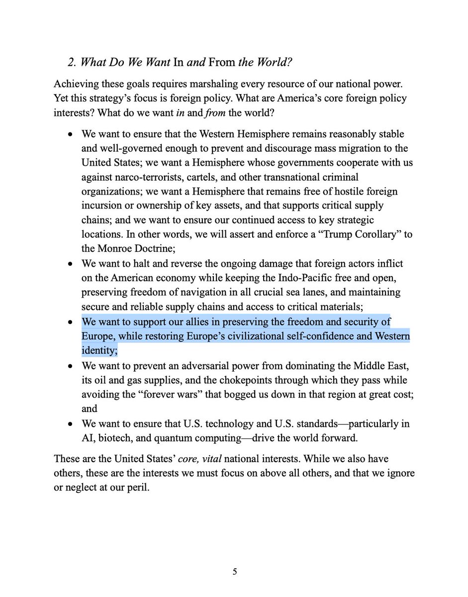 لحن سند NSS 2025 در مورد متحدین اروپایی آمریکا قطعا برای آنها نامید کننده است. مساله تامین امنیت و تمامیت ارضی کشورهای اروپایی برای آمریکا ظاهرا مساله ای حیاتی نیست؛ و مساله مهاجرت و آزادی بیان برای جریانهای راست و حفظ هویت غربی برای دولت ترامپ به مراتب حیاتیتر از تهدید روسیه