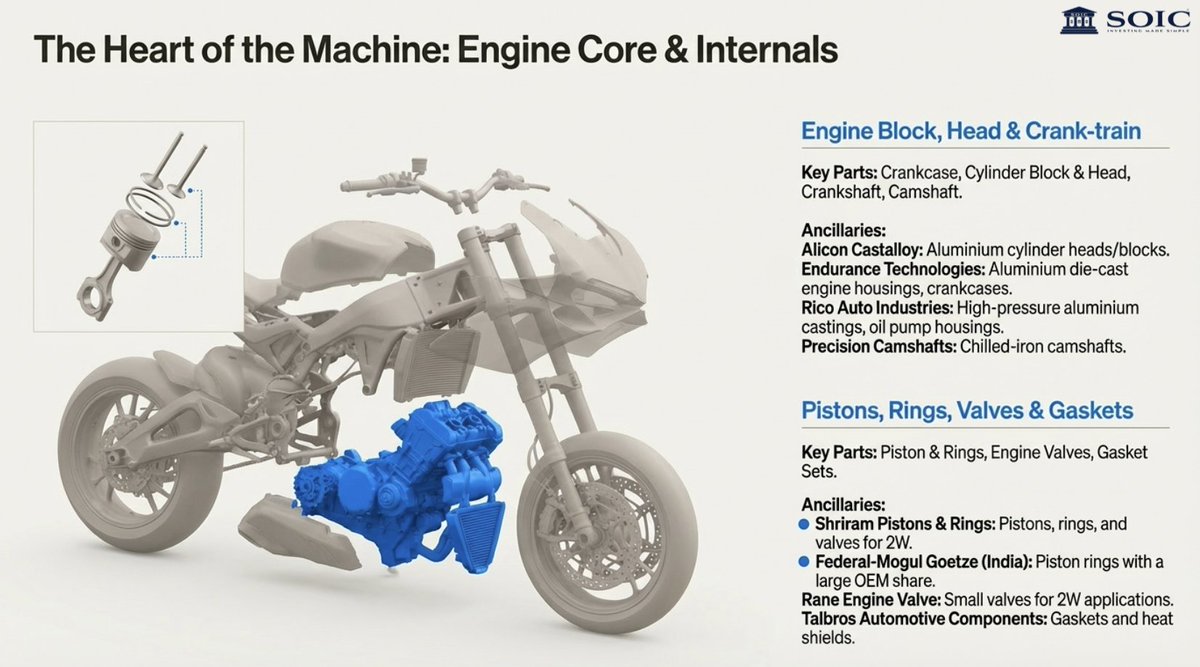 The Heart - Engine Core & Internals This is where combustion happens. This segment is heavy on precision casting and metallurgy. The Players: 1. Castings (Heads/Blocks): Alicon Castalloy, Endurance Tech, Rico Auto. 2. Camshafts: Precision Camshafts. 3. Pistons & Rings: Shriram Pistons