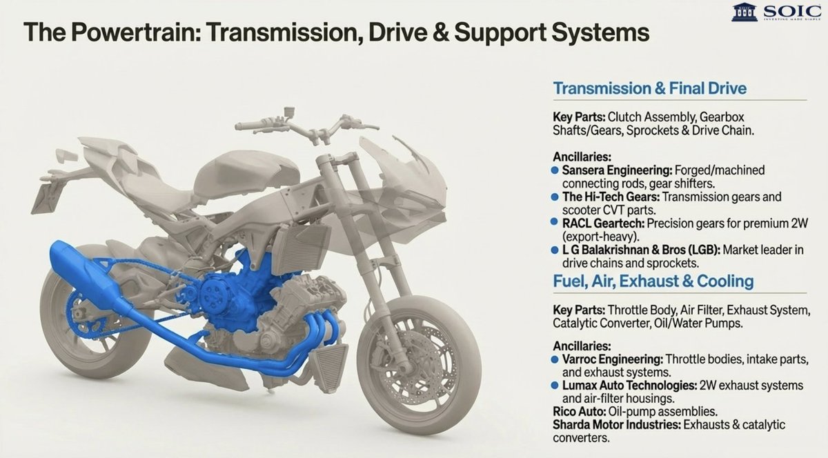 Getting Moving - Transmission, Drive & Exhaust Moving power from engine to wheel, plus managing air/fuel. Key Suppliers: 1. Gears: RACL Geartech (Premium), The Hi-Tech Gears, Sansera (Shifters). 2. Chains/Sprockets: LG Balakrishnan (LGB) is the market leader. 3. Exhausts: Sharda Mot