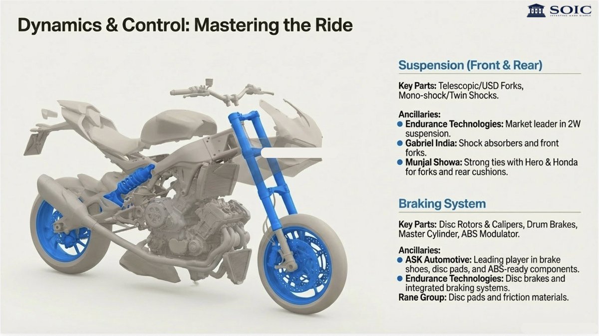 Ride Quality - Dynamics: Suspension & Braking Mastering the ride comfort and safety. Suspension Leaders: 1. Endurance Tech: Market leader in forks/shocks. 2. Gabriel India & Munjal Showa: Strong OEM ties. Braking Leaders: 1. ASK Automotive: Leader in brake shoes/pads. 2. Enduran