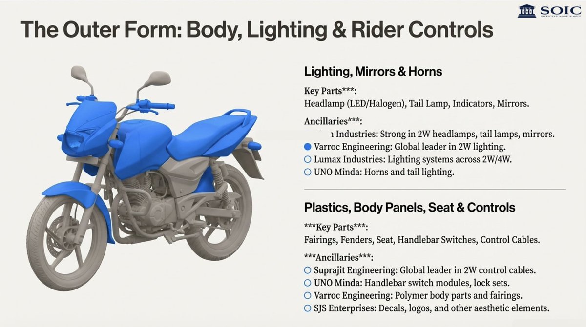 The Look - The Outer Form: Body & Lighting Aesthetics and rider controls. This is where premiumisation getting played out most Lighting (Headlamps/Tail lamps): FIEM Industries, Lumax Industries, Varroc, UNO Minda. Controls & Body: 1. Suprajit Engineering: Global leader in cables.