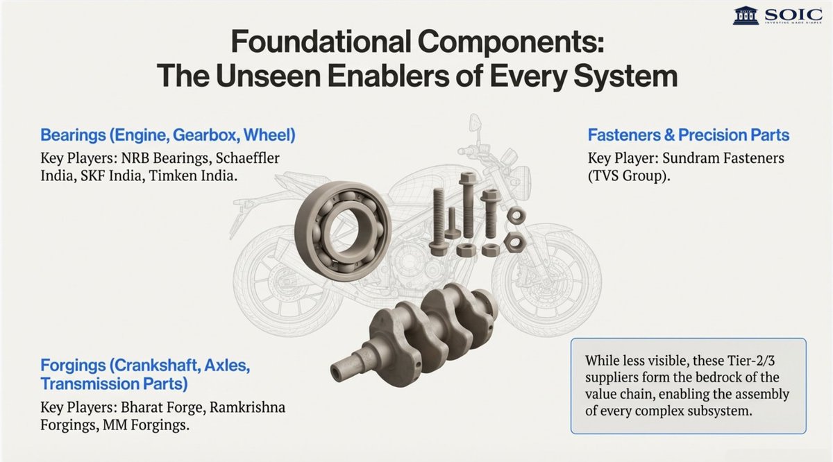 The Unseen Heroes - Foundational Components The "Tier 2/3" bedrock players enabling every subsystem. 1. Bearings: NRB, SKF, Timken, Schaeffler. 2. Fasteners: Sundram Fasteners. 3. Forgings: Bharat Forge, Ramkrishna Forgings, MM Forgings.