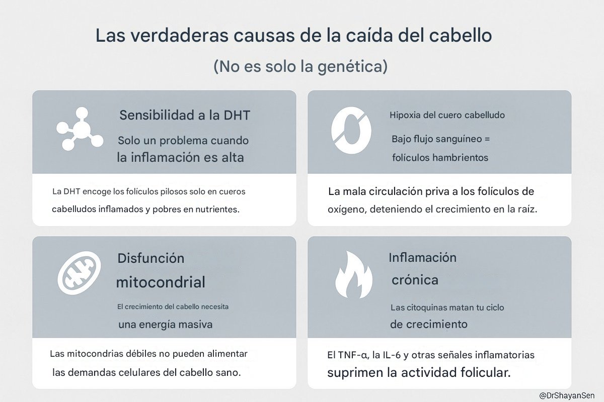 2. Las causas reales (no solo la genética) • Sensibilidad a la DHT: solo es dañina en cueros cabelludos inflamados. • Hipoxia del cuero cabelludo: bajo flujo sanguíneo = folículos hambrientos • Disfunción mitocondrial: ATP bajo = crecimiento débil • Citocinas inflamatorias –