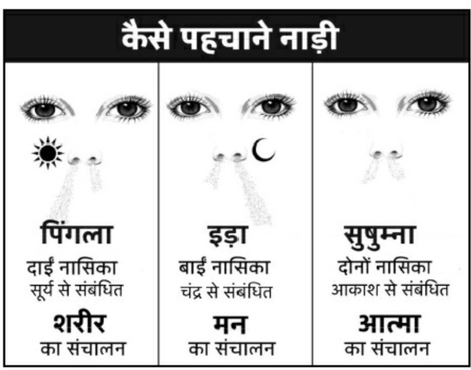 6 ) सबसे पहले यह जान लें कि इड़ा नाड़ी को चंद्र नाड़ी, चंद्र स्वर या बाईं नाड़ी भी कहा जाता है। इड़ा स्त्री प्रधान है, जबकि पिंगला नाड़ी को सूर्य नाड़ी, सूर्य स्वर या दाईं नाड़ी भी कहते हैं। यह पुरुष प्रधान है, इसलिए आगे की जानकारी में इन नाड़ियों के अलग-अलग नामों से भ्रमित न