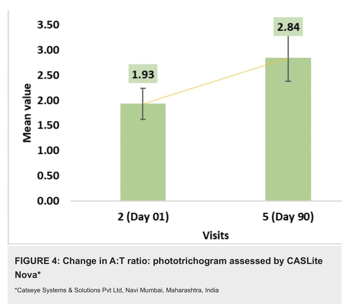 The product also increased the amount of hair in the active growth phase. Typically these conditions are characterized by a low A/T (anagen to telogen) ratio, but after 3 months this product increased it. (4/8)