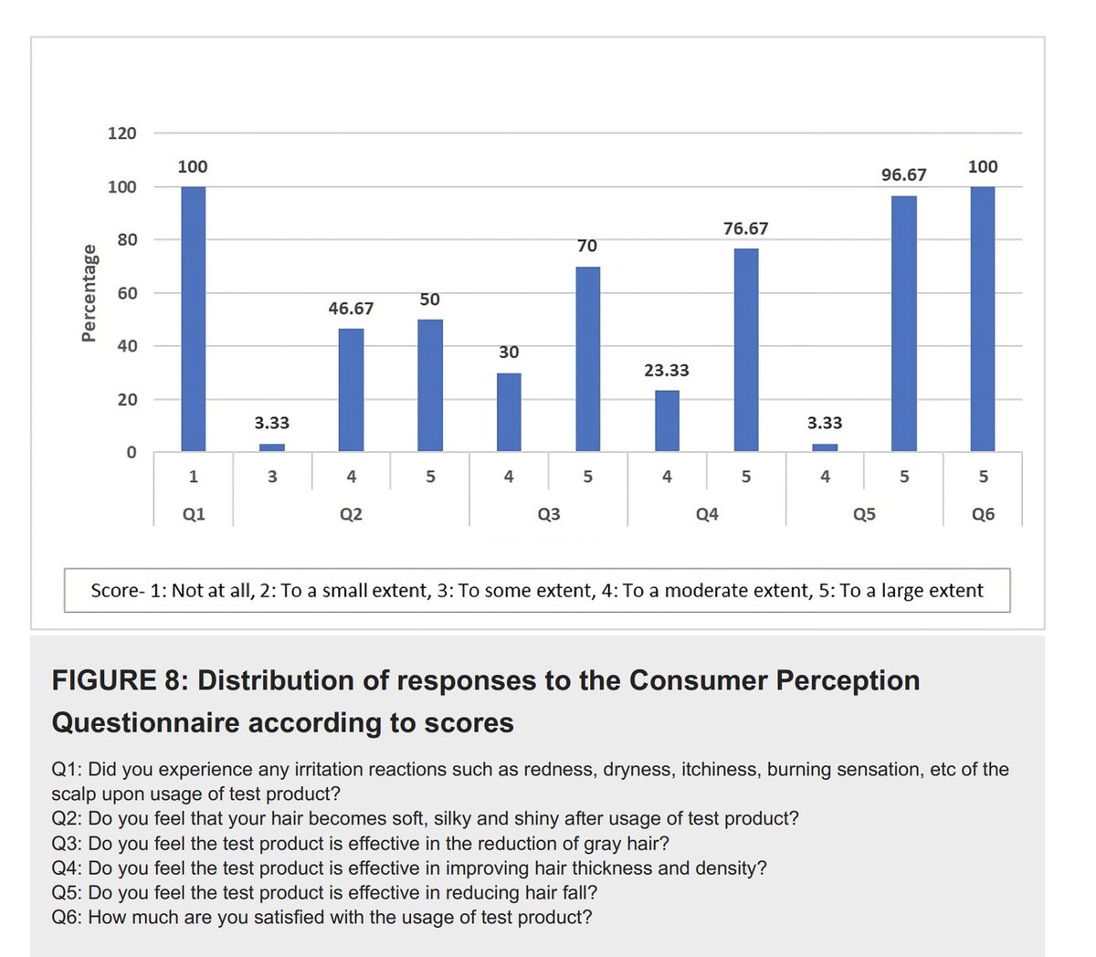 When patients were asked about their experience, they reported strong improvements. 70% said they felt the product improved hair graying "to a large extent" 30% said "to a moderate extent" Not one reported no improvement or worsening. (7/8)