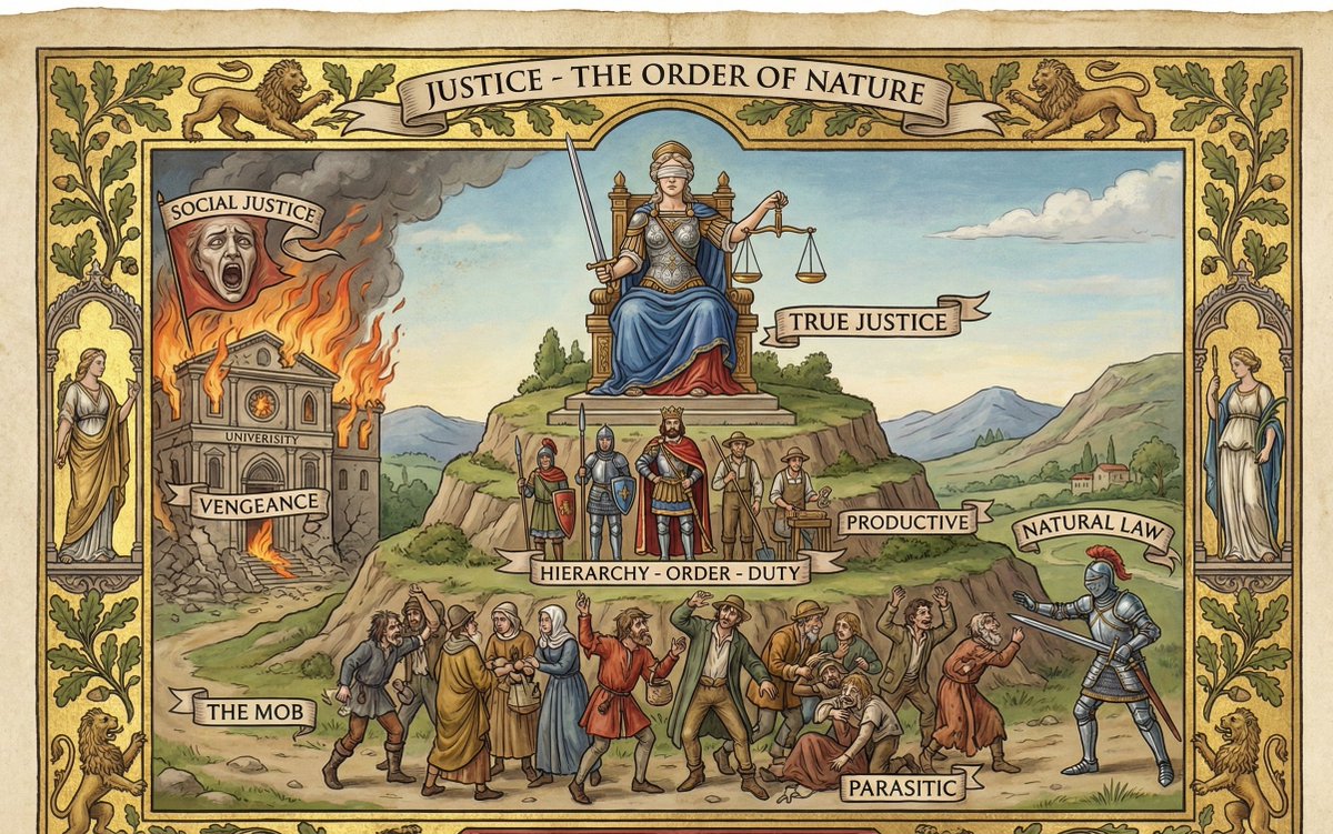 Justice - The Order of Nature Forget the perverted definition of "Justice" screeching from university campuses. "Social Justice" is merely vengeance masquerading as virtue. True Justice is the perpetual will to give everyone what they are due. It is about Hierarchy. Order. Duty.