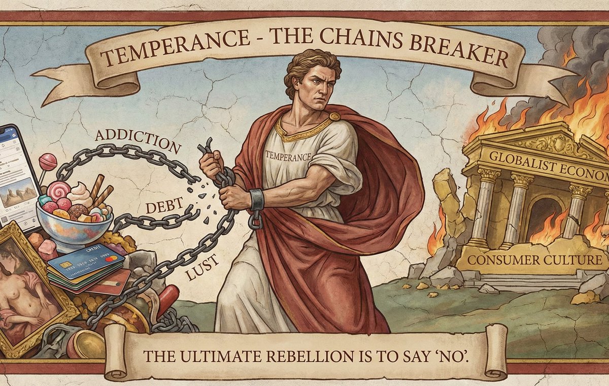 Temperance - The Chains Breaker This is the one you overlook. You think power comes from excess. You are wrong. Temperance is the mastery of desire. The globalist economy is built on your lack of Temperance. They want you addicted to porn, to sugar, to endless scrolling, to