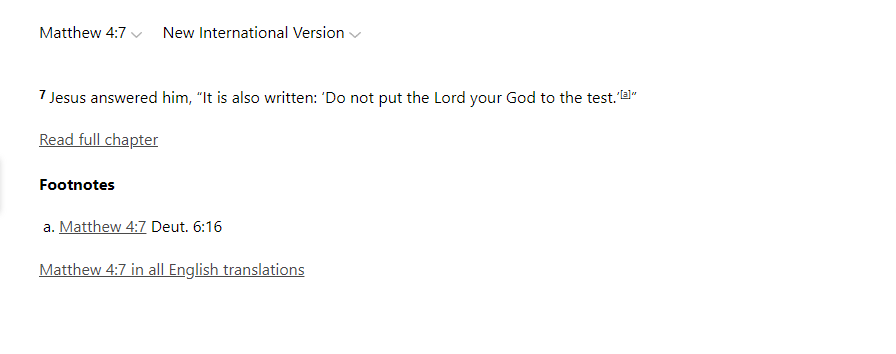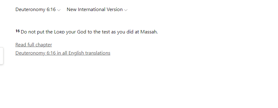 Matthew 4:7?📚 It essentially talks about Satan attempting to "tempt" Jesus, Jesus then states "Jesus said to him, “Again it is written, 'You shall not put the Lord your God to the test.'' It's a parallel verse that follows to Deuteronomy 6:16. Notice how Deuteronomy 6:16 is