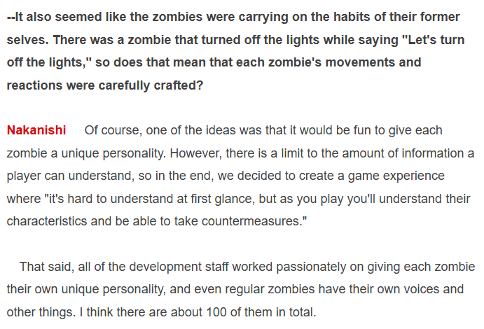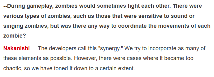 (30/??) Apparently there were more zombie personalities at one point in dev, but it became too chaotic & hard to read, so they limited it for better gameplay feel. Some zombies will fight each other, like one zombie personality hates loud noise, near the loud singing zombie,