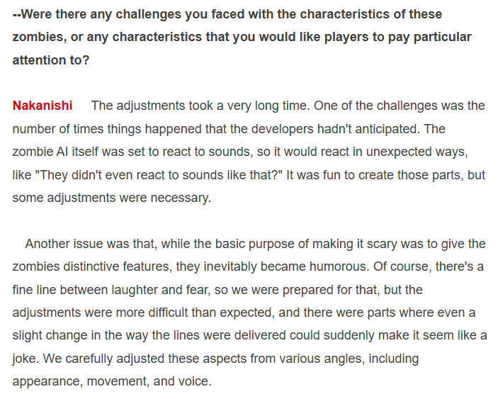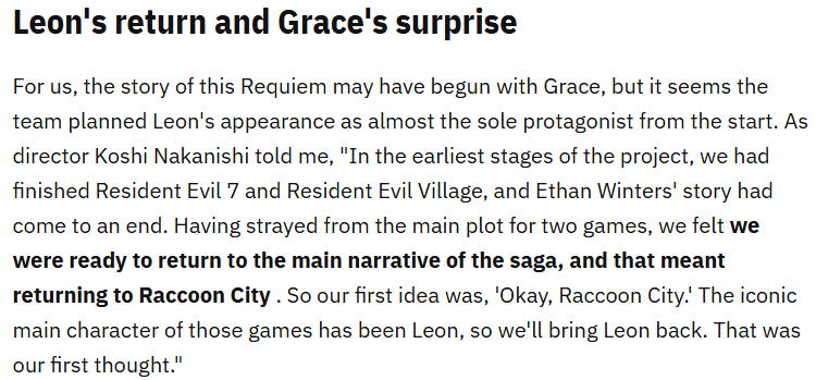 (14/??) Nakanishi (director of Rev 1, RE7 & RE9) says in an interview that the "fear level" of RE9 they didn't hold back in Grace's sections, & that there is horror stuff & scary parts in Leon's sections too, but there's also relief from horror mixed in & moments of pure action.
