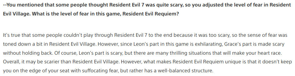 (15/??) He says he thinks its scarier than Village, but not as consistently horror as RE7 as an example, but they didn't hold back in being scary for Grace, & parts of Leon's campaign, just balancing it out also with thrilling moments & relieving sections. An interesting tidbit