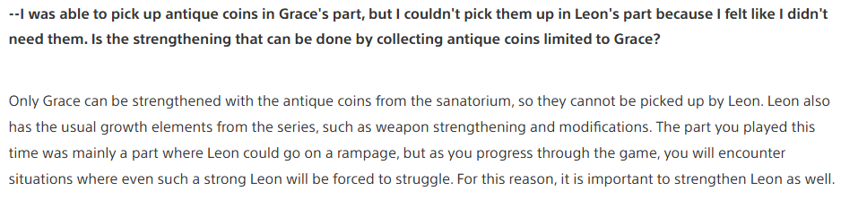 (16/??) is that not only do enemies one doesn't kill pops up for the other, but dropped items as well. They also say it's "very difficult" for Grace to take out every enemy, in a way having Leon able to come later & clear house means they could lean harder into survival-horror
