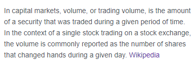 Volume Definition Volume is the number of shares traded over a period of time For example, each daily candle contains the number of shares traded on that day Wordy definition👇